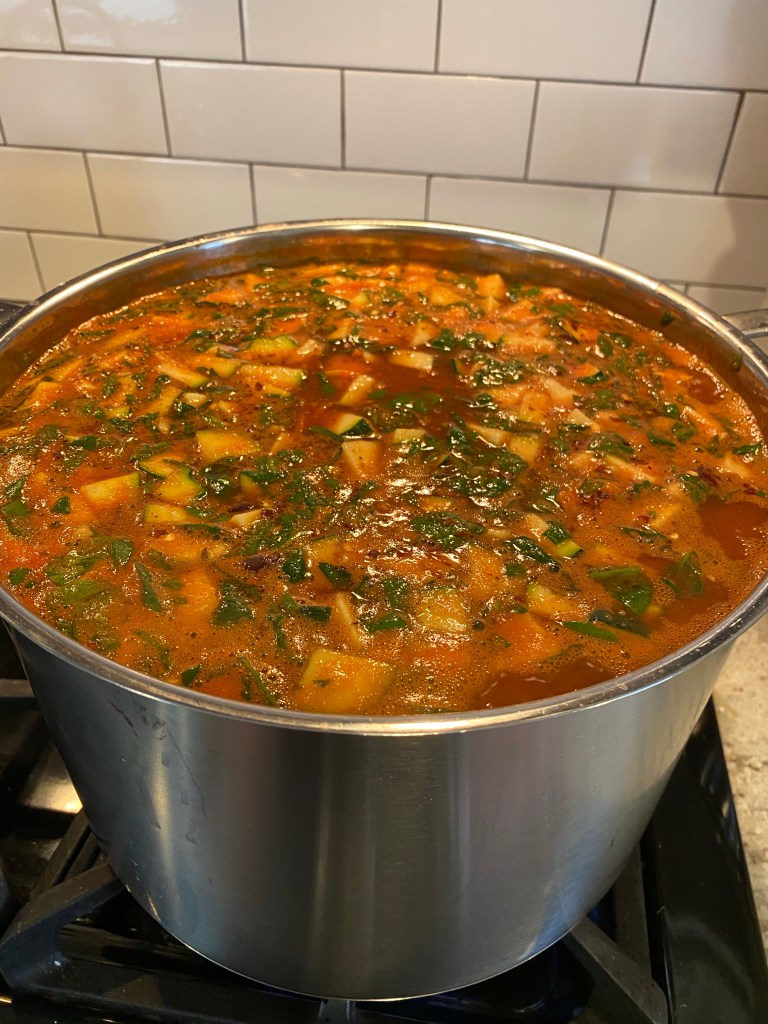 In Large Stock Pot, bring vegetable stock to a boil. Cook pasta, carrots and celery for 10 minutes, stirring in spices. Add crumble mixture to stock pot. Add in all other ingredients.