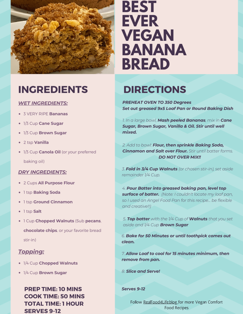 Best Ever Vegan Banana Bread, Dessert, Health & Wellness, Healthy Snacks, Nutrition, Plant-Based Foods, Snacks, Vegan, Vegan Coffee Cake, Vegan Recipe Best Ever Vegan Banana Bread Posted by RealLifeInWords by Sarah Whalen, Coach, Healer on March 14, 2021 Quick and Easy! What to do with those over-ripe bananas! Best Ever Vegan Banana Bread All you need is one bowl for mixing, and a pan to bake it in! This recipe has a crunchy top of nuts and sugar. Tasty and satisfying!! Share this: Click to share on X (Opens in new window) X Click to share on Facebook (Opens in new window) Facebook Click to share on Tumblr (Opens in new window) Tumblr Click to share on Pinterest (Opens in new window) Pinterest Click to print (Opens in new window) Print Click to share on LinkedIn (Opens in new window) LinkedIn Click to share on Reddit (Opens in new window) Reddit Click to email a link to a friend (Opens in new window) Email Like Loading... Related Published by RealLifeInWords by Sarah Whalen, Coach, Healer View all posts by RealLifeInWords by Sarah Whalen, Coach, Healer