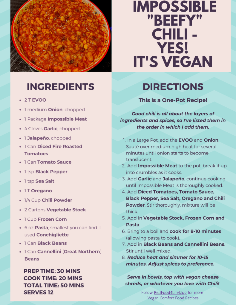 Impossible Meat Chili, Nutrition, Plant-Based Foods, Vegan, Vegan Chili, Vegan Recipe, Vegan Soup Impossible “Beefy” Chili Posted by RealLifeInWords by Sarah Whalen, Coach, Healer on November 17, 2021 Impossible “Beefy” Chili Yes! It’s Vegan! This is the best vegan chili I’ve ever tasted. It’s a one-pot easy recipe that goes from cupboard to table in about an hour. Your non-vegan friends will never guess they’re eating vegan chili! Impossible “Beefy” Chili Recipe Share this: Click to share on X (Opens in new window) X Click to share on Facebook (Opens in new window) Facebook Click to share on Tumblr (Opens in new window) Tumblr Click to share on Pinterest (Opens in new window) Pinterest Click to print (Opens in new window) Print Click to share on LinkedIn (Opens in new window) LinkedIn Click to share on Reddit (Opens in new window) Reddit Click to email a link to a friend (Opens in new window) Email Like Loading... Related Published by RealLifeInWords by Sarah Whalen, Coach, Healer View all posts by RealLifeInWords by Sarah Whalen, Coach, Healer